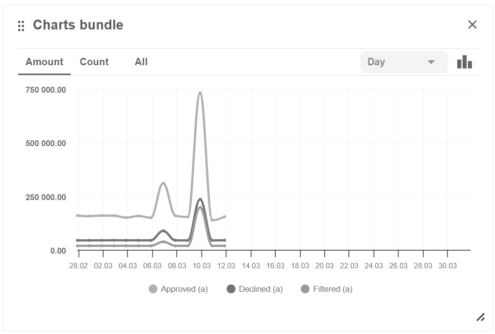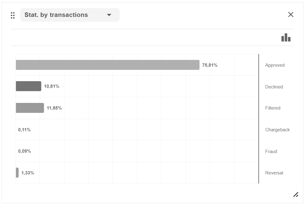button: the ratio by volume of transactions or by amount of payments, as well as by type of transactions (sale, capture, transfer, etc). Denumtech Payment Gateway also displays statistics on negative activity and earnings.